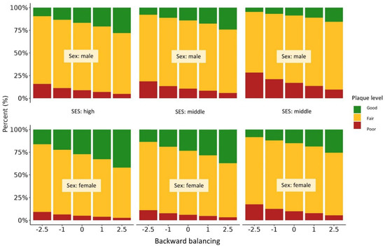 As revealed by the proportional odds model, better results in precision coordination tests (one-leg-stand: p = 0.003; backward balancing: p = 0.037) were significantly related to better oral hygiene (Table 5, Figure 3 and Figure 4). The odds for more plaque accumulation were reduced by about 23% when having better results in the one-leg-stand test. For better scores in the backwards balancing test, a risk reduction for dental plaque by about 14% was shown. The side-to-side jumping test showed no significant association with the level of plaque (Figure 5). A low SES doubled the odds for more dental plaque (OR = 2.1–2.4, p = < 0.001–0.002). With increasing age, the level of plaque accumulation decreased (OR ≈ 0.9, p = 0.014–0.023). In addition, the analysis revealed that girls in our cohort had odds ratios of approximately 0.5 for dental plaque compared with boys (p < 0.001). Again, we found no significant influence of orthodontic treatments on the participants’ oral health. The proportional odds model provided a useful extension of the binary logistic models as the response variable dental plaque is defined in ordered categories [38].