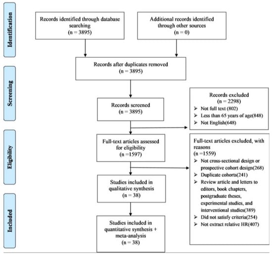 Figure 1 depicts the details of the literature review. Among the initial studies identified, we excluded any study that lacked full text, was not in English, and duplicate cohorts and review articles, or that did not satisfy the inclusion criteria. After excluding these studies, we included 38 prospective cohort studies after agreement by the two reviewers. Table 1 summarises the characteristics of these studies for meta-analysis.