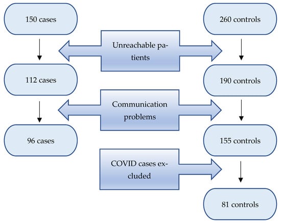 Secondary exclusion criteria were unreachable patients and those with communication problems. Among the control population, we also asked and excluded patients who presented a positive test for COVID-19 (PCR, antigen, and/or serology) between the initial consultation and telephone call.