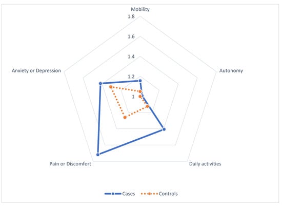 Approximately 43% of the cases complained of a problem in the area of pain or discomfort compared to 21% of the controls. Regarding daily activities, approximately 23% of the cases complained of a problem compared to 6% of the controls.