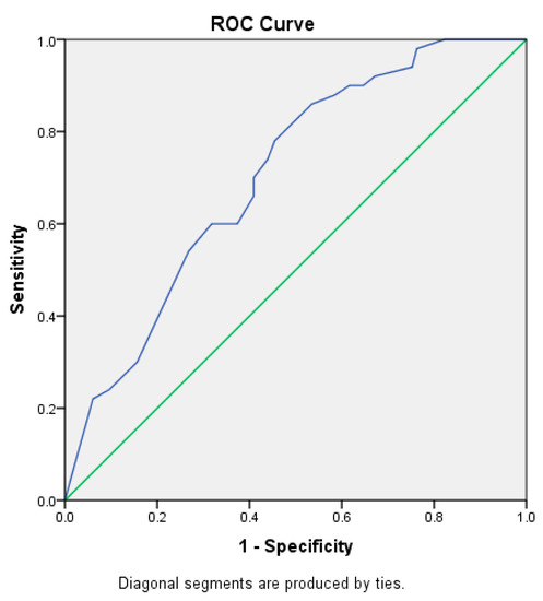 Using the multivariate model, the ROC curve (Figure 1) was obtained, and the area under the curve (AUC) was determined to be 0.705 with 95% CI = (0.631–0.778).