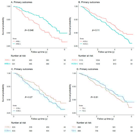 Kaplan−Meier survival analysis for primary outcomes within each antihypertensive therapy group. ((A): ARB; (B): ACEI; (C): CCB; (D): TD).