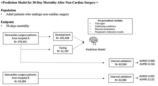 Machine-learning techniques recently gained attention for handling numerous variables in nonlinear and interactive ways []. They have been actively used to evaluate predictors in various fields including medicine [,]. Previous studies reported that artificial intelligence has excellent performance for predicting postoperative mortality, and these models included intraoperative variables and were designed for real-time prediction during surgical procedures [,]. However, it is often unenviable for clinicians to decide on surgery based on preoperative risk and benefit. Thus, this study used a preoperative evaluation sheet to develop a prediction model based on machine-learning techniques. A preoperative evaluation sheet is a final document from which an attending anesthesiologist can gather a patient’s entire medical record related to surgical outcomes, allowing them to determine an anesthetic plan. The format of preoperative evaluation documents may vary between centers, but they commonly include well-known risk factors such as age, type of surgical procedure, results of blood laboratory tests, and underlying disease. In this study, we developed a prediction model for 30-day mortality after non-cardiac surgery from a single center and validated it with data from another center. Our results may offer the possibility of implementing a prediction model into an electronic medical record system in which clinicians can monitor mortality risk in real-time during preoperative evaluation and detect modifiable factors conveniently.