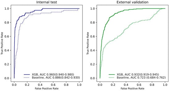 The AUROCs for the XGB, RF, LR, and NB algorithms are described in Supplementary Table S2. Because the AUROC for the XGB model is higher than the other algorithms in the tuning dataset, we selected the XGB algorithm for the final model. For the internal validation set, the XGB-based mortality prediction model yielded AUROC = 0.960 (95% CI: 0.940–0.980) and AUPRC = 0.216. Model performance for the external dataset was AUROC = 0.932 (95% CI: 0.919–0.945) and AUPRC = 0.122 (Figure 2). Otherwise, the baseline model yielded AUROC = 0.886 (95% CI: 0.842–0.930) and AUPRC = 0.014. Model performance for the external dataset was AUROC = 0.723 (95% CI: 0.684–0.762) and AUPRC = 0.021. The XGB model showed a superior performance difference of more than AUC 0.2 in external validation. Additionally, the XGB model’s AUPRC was 0.1 or more in internal validation and 0.2 or more in external validation