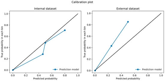 With an optimal threshold calculated by Youden’s J statistic, the model yielded sensitivity = 0.885 and specificity = 0.914, PPV 0.082, NPV = 0.999 for internal validation and sensitivity = 0.873, specificity = 0.853, PPV = 0.167, NPV = 0.997 for external validation. In calibration analysis, the Brier score and ICI were 0.0015 and 0.0044 for internal validation and 0.0036 and 0.0017 for external validation. The difference between the model’s predicted score and the proportion of clinical outcomes is illustrated in Figure 3.