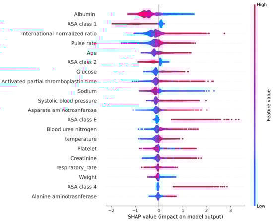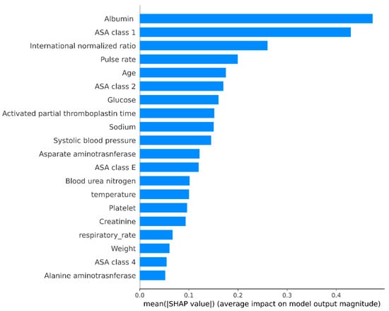 Based on the prediction model results, we generated a SHAP bar plot (Figure 4) and a SHAP beeswarm plot (Figure 5). In the SHAP bar plot, the top five variables were albumin (0.47), ASA physical status 1 (0.43), international normalized ratio (0.26), pulse rate (0.2), and age (0.18). The SHAP beeswarm plot shows that lower serum albumin, sodium, and body weight were associated with higher mortality. Higher levels of glucose, aPTT, BUN, and creatinine were also associated with increased mortality.
