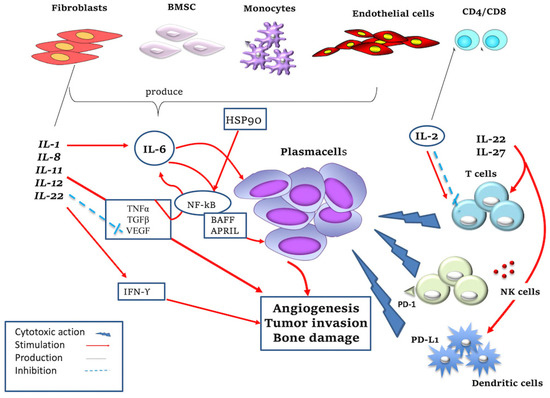 Mechanism of action of pro- and anti-inflammatory cytokines. IL-1, produced by various cell types in the BM microenvironment (i.e., fibroblasts, B lymphocytes), promotes PCs’ survival by stimulating IL-6 production. IL-2 is produced by CD8+ and CD4+ T lymphocytes and promotes the growth of T and NK cells but at the same time induces apoptosis of T cells; it also stimulates the cytotoxic action of NK cells against malignant PCs. IL-6 promotes the growth of MM PCs and resistance to apoptosis; IL-6 is secreted by BMSCs, monocytes, endothelial cells, macrophages and fibroblasts thanks to the action of TGF-β, TNF-α, VEGF, IL-1. IL-1 and TNF are potent inducers of IL-6 synthesis. In detail, they regulate IL-6 gene expression at the level of transcription, which is mediated by upregulation of NF-kB activation. IL-6 stimulates the production of APRIL and BAFF, which activate NF-kB, phosphatidylinositol-3 (PI-3) kinase/AKT and MAPK pathways, promoting MM cells’ survival. IL-8 has a pro-tumor function promoting angiogenesis and tumor invasion. IL-11 promotes tumor invasion and in particular bone damage. IL-12 stimulates the production of IFN-γ with both pro-inflammatory and anti-angiogenic roles and this inhibits the production of VEGF. IL-22 is produced by T lymphocytes, activates the innate immune system and also regulates cell proliferation and resistance to drug-induced cell death in MM cells. IL-27 has antitumor activity, causing increased proliferation and differentiation of T cells. IL-27 stimulates the expression of immune checkpoint inhibitor programmed death (PD)-1 or PD-L1 in different cell types (i.e., lymphocytes and dendritic cells) and increases NK cells’ activity. HSP and HSP90 are produced by macrophages/monocytes and promote MM cell survival through TNF-mediated and NF-kB signaling pathways.