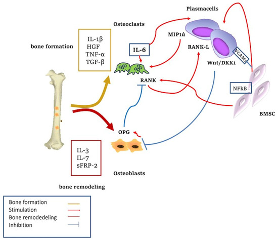Several cytokines and growth factors are involved in the downregulation of osteoblastic activities. Exceptionally fundamental in bone formation and remodeling are the Wnt/dickkopf homolog 1 (DKK1) pathway, IL-3, IL-7, secreted frizzled-related protein-2 (sFRP-2), runt-related transcription factor 2 (Runx2), HGF, and TGF-β [78]. The activation of Runx2 and the Wnt pathways induce the differentiation of resident macrophages in osteoclasts and the transdifferentiation of PCs to functional osteoclasts [78,79].