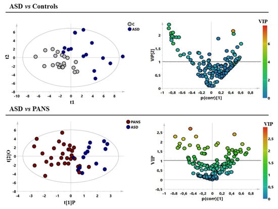 Initially, principal component analysis (PCA) was performed using the whole bins dataset (ASD, PANS, and controls sample). Hotelling’s T2 test identified one strong PANS outlier, which was ruled out (Figure S1). Subsequently, supervised models (PLS-DA and OPLS-DA) were performed to compare firstly ASD with HC and then PANS with ASD classes (Figure 1). Separation of the samples consistent with clinical diagnoses was observed and the models were validated with the respective permutation test (Table 2).