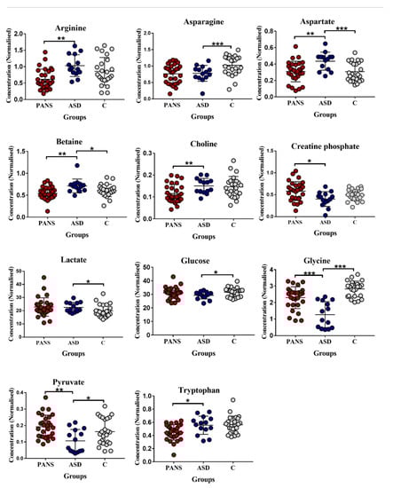 With a cut-off of p < 0.05, asparagine, aspartate, betaine, glycine, lactate, glucose, and pyruvate showed the greatest differences between ASD and HC, while arginine, aspartate, betaine, choline, creatine phosphate, glycine, pyruvate, and tryptophan exhibited the largest differences between PANS and ASD groups (Figure 2).