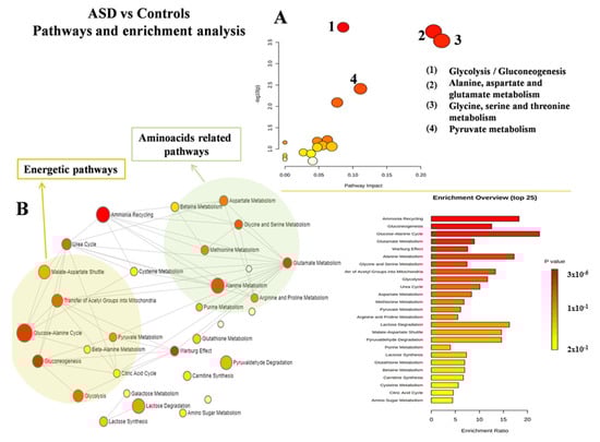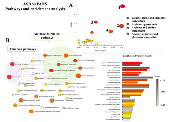 Metabolic pathways’ analysis (A) and enrichment analysis (B) of the comparison between ASD (autism spectrum disorder) and PANS (pediatric acute-onset neuropsychiatric syndrome) patients.
