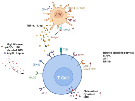 Activation pathways of T lymphocytes in diabetes. Direct contact between APC and T cells through MHCII and co-stimulators on the cell surface; increased glucose, AGEs, LDL, ROS, Ang II and leptin in diabetic microenvironment or cytokines such as TNF-α and IL-1β secreted by APC activate T cells, forming the paracrine pathway. Red arrows represent the upregulation of gene expression or increase of risk factors in diabetes. Black dotted arrows stand for cellular interaction through paracrine pathway. AGEs, advanced glycation end-products; AT1R, angiotensin II type 1 receptor; ICAM-1, intercellular adhesion molecule-1; LDL, low-density lipoprotein; RAGE, receptor for advanced glycation end products; ROS, reactive oxygen species; ICOSL, inducible co-stimulatory molecule ligand; MHCII, major histocompatibility complex class II; MAPK, mitogen-activated protein kinase; AKT, v-akt murine thymoma viral oncogene homologue; NF-KB, nuclear factor-kappaB.