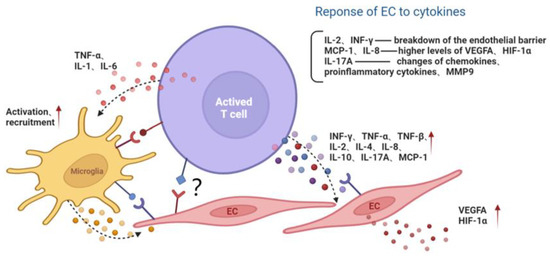 The interaction among activated T lymphocyte, endothelial cell and microglia. Activated T cells secrete cytokines or directly contact microglia and the EC, aggravating the inflammatory microenvironment and endothelial dysfunction. Red arrows represent the upregulation of gene expression. Black dotted arrows stand for cellular interaction through paracrine pathway. EC, endothelial cell; MMP9, matrix metalloproteinase 9; MCP-1, monocyte chemoattractant protein-1; INF, interferon; TNF, tumor necrosis factor; IL, interleukin; VEGFA, vascular endothelial growth factor A; HIF-1α, hypoxia inducible factor-1α.