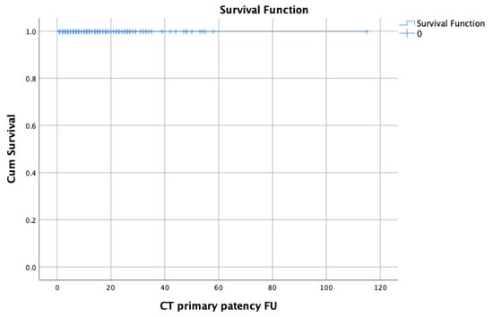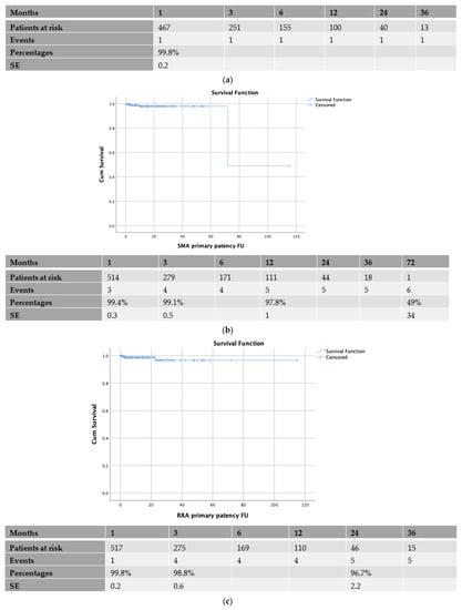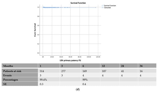 The CT patency rate was 99.8% (SE 0.2%) at 1 month, while no other event was identified for up to 3 years of the follow-up (Figure 1a). The SMA patency rate was 99.4% (SE 0.3%), 99.1% (SE 0.5), and 97.8% (SE 1) at the 1-, 3-, and 12-month follow-up, respectively, with no other event during the follow-up (Figure 1b). The RRA patency rate was 99.8% (SE 0.2%), 98.8% (SE 0.6), and 96.7% (SE 2) at the 1st, 3rd, and 24th month, respectively (Figure 1c). The LRA patency rate was 99.4% (SE 0.3%) and 99% (SE 0.4) at the 1st and 6th month, respectively, with no other event during the follow-up (Figure 1d). The TV patency is depicted in the Kaplan–Meier curves in Figure 1a–d.