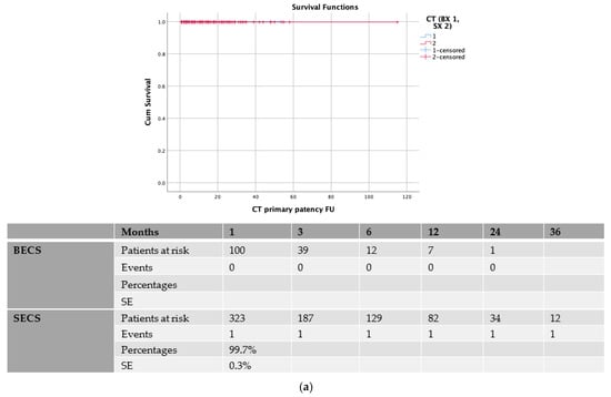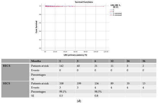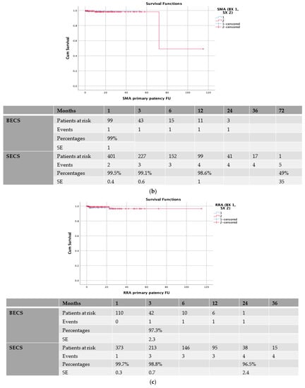 In the sub-analysis of the primary patency between the BECSs and SECSs, there was no statistically significant patency difference for the CT; in the BECS group, the CT patency was 100% up to 2 years, while in the SECS group, the CT patency was 99.7% (SE 0.3) at the 1st month while no other event was reported during the follow-up (p = 0.5, Figure 2a). There was also no difference in terms of patency for the SMA bridging stent, thus in the BECS group, the SMA patency was 99% (SE 1) at the 1st month, while no other event was reported, while in the SECS group, the SMA patency was 99.5% (SE 0.4), 99.1% (SE 0.6), and 98.6% (SE 1) at 1st, 3rd, and 12th months, respectively, with no other event during the follow-up (p = 0.86, Figure 2b). There was no difference in terms of the patency for the RRA bridging stent. In the BECS group, the RRA patency was 97.3% (SE 2.3) at the 3rd month, while no other event was reported, while in the SECS group, the RRA patency was 99.7% (SE 0.3), 98.8% (SE 0.7), and 96.5% (SE 2.4) at the 1st, 12th, and 24th month, respectively (p = 0.78, Figure 2c). Finally, no difference was noted in the patency for the LRA, thus in the BECS group, the LRA patency was 100% with no event during follow up, while in the SEGS group, the LRA patency was 99.1% (SE 0.5) and 98.5% (SE 0.8) at the 1st and 6th month, respectively, with no other event during the follow-up (p = 0.22, Figure 2d).