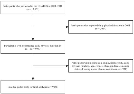 This study combined health status and function data based on ID for a total of 4 years in 2011, 2013, 2015, and 2018. After merging, a total of 13,051 participants were selected in this study. Of these, a total of 9056 participants were ultimately included in the study analysis after those with impaired daily physical function in the 2011 baseline survey (n = 3064) and those with missing data for physical activity, daily physical function, and covariates (n = 931) were excluded (Figure 1).