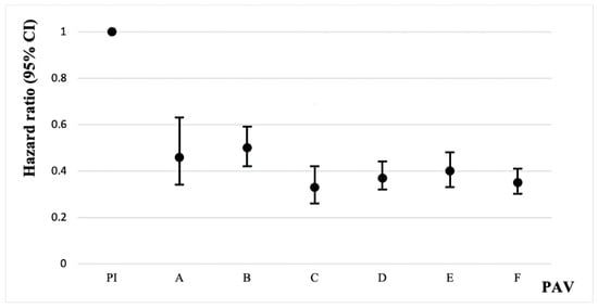 Plot of associations between study participants in different PAV groups and impaired physical function. Whiskers represent 95% confidence intervals. A: 600 ≤ PAV ≤ 1199. B: 1200 ≤ PAV ≤ 1799. C: 1800 ≤ PAV ≤ 2999. D: 3000 ≤ PAV ≤ 5999. E: 6000 ≤ PAV ≤ 8999. F: PAV ≥ 9000. Unit: MET-minutes/week.