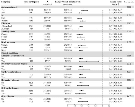 Subgroup analysis of the association between study participants with a PAV ≥ 600 MET-minutes/week and impaired physical function.