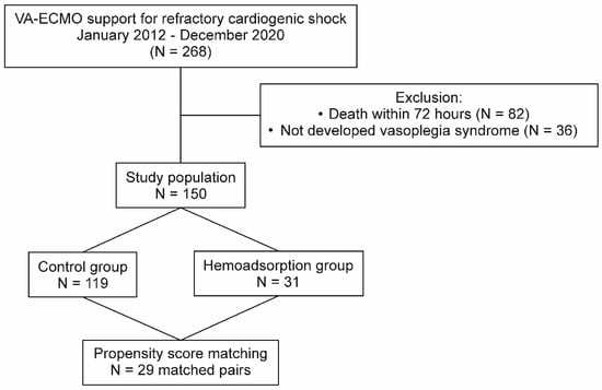 Overall, 268 patients were treated with refractory CS and VA–ECMO support in the investigated period at our institution. After the exclusions, the PSM procedure involving 150 patients resulted in 29 matched pairs (Figure 1). The absolute values of standardized mean differences were found to be less than 0.225 for all adjusted covariates. APACHE II and SOFA scores achieved balance by PSM, which indicated similar risks for early mortality in both groups prior to VA–ECMO implantation. The univariate analyses of the baseline parameters did not reveal relevant differences between the two groups in terms of patient characteristics (Table 1). However, the peripheral VA–ECMO support was less frequent in patients of the hemoadsorption group than the control group. The patient selection process and the clinical characteristics in the unmatched and matched cohorts are summarized in Figure 1 and Table 1, respectively.