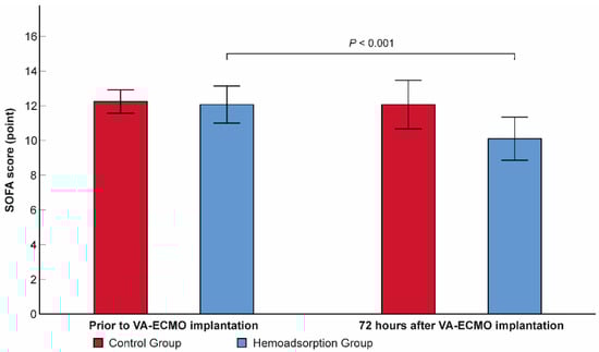Multiorgan dysfunction is a dominant contributing factor of in-hospital mortality risk associated with refractory CS []. The SOFA score is a widely employed composite assessment tool in critical care to classify and monitor multiorgan dysfunction over time []. SOFA score assessed prior to VA–ECMO initiation has been found to have good predictive value for in-hospital mortality in earlier clinical investigations of patients undergoing VA–ECMO support [,,]. Similarly, a decreasing SOFA score at day 3 of VA–ECMO support has been associated with better hospital survival in the same clinical scenario, demonstrating the link between the early improvement of organ function and outcome [,]. In our study, we observed significantly reduced mean SOFA scores in the hemoadsorption group after 72 h of VA–ECMO start compared to the initial value (Figure 2). Despite the identical combined mechanical and pharmacological circulatory support applied in the control group the mean 72-h SOFA score persisted in the pre–ECMO range in these subjects. Only very few clinical studies and case series have previously examined the significance of ECMO integrated hemoadsorption on patient outcome–among them, two comparative investigations involving VA–ECMO patients [,,]. Of these two studies only the randomized controlled trial (RCT) published by Supady et al. used longitudinal SOFA score follow-up []. They did not find any significant differences in either the longitudinal change or the 72-h values of the SOFA scores []. However, 54.5% of patients in the cytokine adsorption group, and 73.7% of patients in the control group compared to baseline survived the 72-h timepoint in their study, which restricts the interpretation of SOFA score change in the study groups []. In our analysis, we excluded patients who died on VA–ECMO within 72 h to mitigate patient selection bias in the advanced analyses, which resulted in the complete comparison of groups in terms of SOFA score change. Interestingly, in a recent RCT including patients with severe COVID–19 pneumonia requiring venovenous ECMO, a marked reduction in SOFA score was seen in the cytokine adsorption group versus controls with a time frame of 72 h, despite the lower range of initial SOFA scores registered in the groups []. These results are in line with the findings of our study supporting the assumption that VA–ECMO integrated hemoadsorption can contribute to accelerated the reversal of multiorgan dysfunction induced by refractory CS.