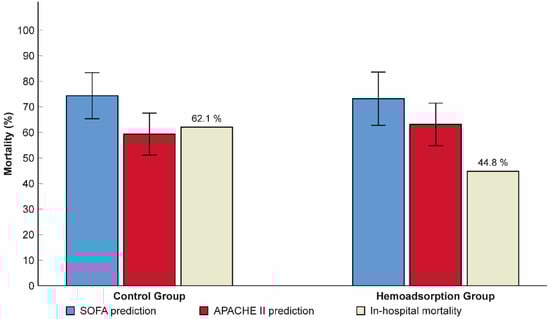 Subjects from the hemoadsorption group experienced a significant reduction in the follow-up 72-h SOFA score from 12.1 ± 2.8 to 10.1 ± 3.3 (p < 0.001), with no difference detected in the control group (12.2 ± 1.8 versus 12.1 ± 3.7, p = 0.815, respectively; Figure 2). Additionally, the 72-h SOFA score was also significantly lower in the hemoadsorption than in the control group (Table 2). We registered a higher frequency of in-hospital mortality in the control compared to the hemoadsorption groups (62.1% vs. 44.8%, respectively), however, this difference was not statistically significant (Table 2). Interestingly, the observed in-hospital mortality was also lower than the mean predicted value calculated according to the APACHE II and SOFA scores prior to VA–ECMO initiation in patients from the hemoadsorption group (44.8% vs. 63.1% and 73.2%, respectively), while there were no relevant differences in the controls (62.1% vs. 59.3% and 74.4%, respectively, Figure 3).