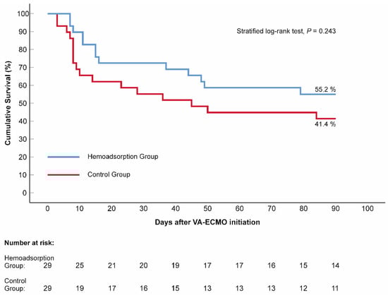Kaplan–Meier estimates of cumulative 90-day survival, according to the applied venoarterial extracorporeal membrane oxygenation management. N = 58. The blue line represents the hemoadsorption group, while the red line illustrates the control group. p value (stratified log–rank test) indicates the difference in survival. VA–ECMO: venoarterial extracorporeal membrane oxygenation.