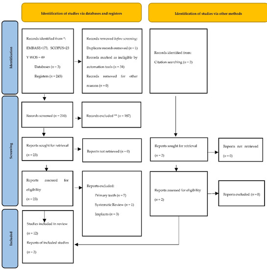 The initial electronic search identified 173 studies in Embase, 23 in Scopus, and 49 in WOS. Out of the 245 articles, 240 remained after removing duplicates; 187 studies were excluded after reviewing titles and abstracts. A total of 23 articles were eligible for full-text reading, and, subsequently, 11 articles were eliminated for not meeting the inclusion criteria (type of restoration and permanent teeth). Finally, 12 studies were chosen, and another 2 studies were included by manual search. This means that 14 studies were used for qualitative and quantitative analysis (Figure 1).