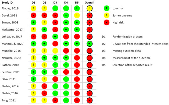 Fourteen clinical trials were identified using Cochrane’s RoB 2.0 tool for the quality assessment [8], obtaining one study with a low risk of bias [9], another one with an unclear risk of bias [4], and twelve studies with a high risk of bias (Figure 2).