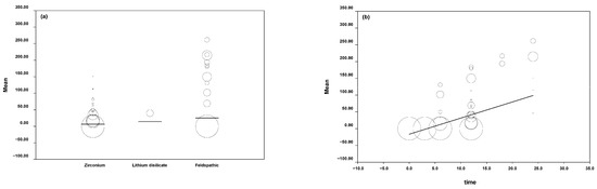 In terms of linear wear, based on the meta-regression carried out by [9,16,18], it was found that feldspathic is the ceramic that produces the most significant wear [9,11,14]. We can observe greater wear values for feldspathic used as a comparison group to other ceramics. Lithium disilicate causes intermediate wear [20], which means that the average wear produced is less than the comparison with zirconia. The material that produces the least linear wear in the dental tissue is zirconia, which has been used in most studies carried out by [9,16]. Zirconia also maintains lower values than feldspathic and lithium disilicate, which is why it was used as a moderator in the meta-regression. This result contrasts with the study performed by [15], in which the greatest wear was produced by zirconia when compared to lithium disilicate, coinciding with the volumetric wear in our study.
