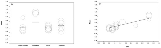 The mean wear was obtained from the included studies in the meta-regression that analyzed the linear wear of the antagonist tooth caused by ceramic. These results were presented in descending order according to the type of ceramic (feldspathic: 8.9149 μm, lithium disilicate: 0.0189 μm, and zirconia: 0.2574 μm).