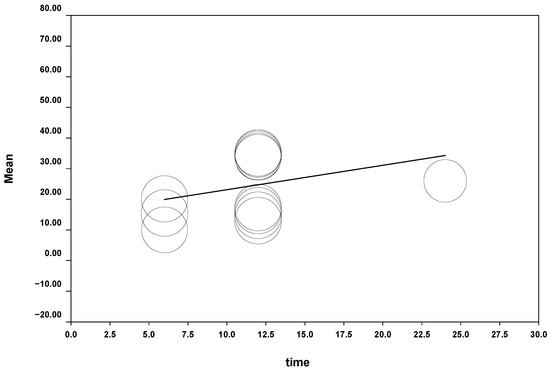 The model was obtained with a Q test = 75.08 (p = 0.0000); this is indicative that the variable time is significant in the model, giving a predictive capacity of 83% (R2 = 8.3). The beta coefficient of time was 0.0186 with a p value = 0.0003 and CI at 95% (0.0085–0.0287) (Figure 4).