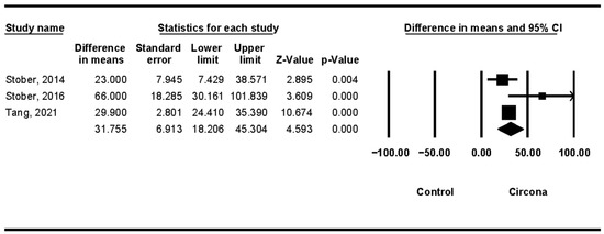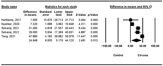 In 12 months, a mean difference of 24.648 μm was obtained. In the meta-analysis, there was a high degree of heterogeneity between the combined studies [12,15,17,21] (Q test = 99.518; p-value = 0.0000) (Figure 7).