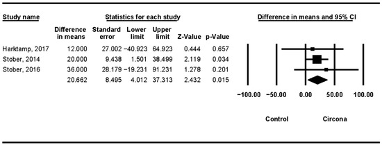 In 24 months, a mean difference of 20.662 μm was obtained in the meta-analysis [12,19,20], (Q test = 0.404; p-value = 0.817) (Figure 8).