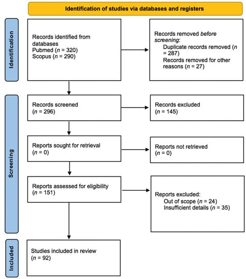 The electronic searches retrieved 296 records after removing duplicates. After reviewing the titles and abstracts, we examined the full text of the remaining 151 citations, of which 92 fulfill inclusion criteria.