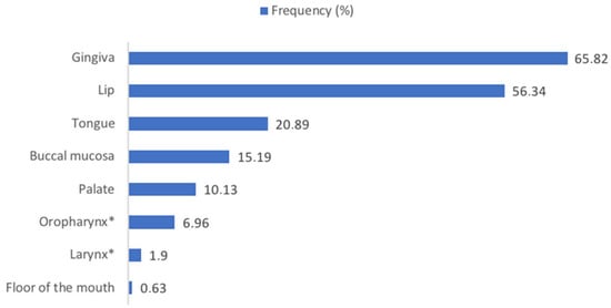 Figure 2 shows the frequency of the oral sites involved by o-PCM. The percentages exceed 100 because most of the patients showed multiple site involvement. The gingiva (65.82%) was found to be the most frequent site in this cohort; the most uncommon site reported was the floor of the mouth (0.63%).