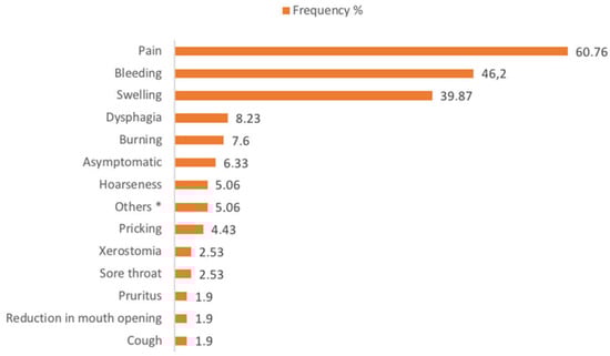 The frequency of oral symptoms and signs was reported in Figure 3, where pain (60.76%) and bleeding (46.20%) were the most reported.