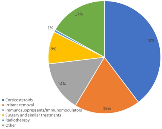 Among the 290 treatment regimens described, 115 (39.66%) were corticosteroids. The molecules administered and the efficacy of the steroid therapy are shown in Table 5. In the 19 cases (16.52%) in which corticosteroids were used effectively in association with other therapy, the molecule administered in combination was always found to belong to the class of corticosteroids in 13 cases (68.42%), removal of the identified irritant was associated in 13 cases (68.42%), an immunosuppressant (Mycophenolate Mofetil and Tacrolimus) was associated in 2 cases (10.53%), and, in 2 cases (10.53%), the association with phototherapy, topical antifungals, and antihistamines was reported.