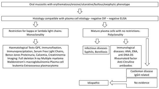 Finally, it should be remembered that plasma cell infiltrate in an oral biopsy can be an expression of underlying systemic diseases. Therefore, as shown in Figure 5, it is necessary to exclude any other disease whose oral histological manifestation involves the presence of plasma cells: among these we remember monoclonal gammopathy of undetermined significance, multiple myeloma, lymphoplasmacytic lymphoma/Waldenstrom macroglobulinemia, and amyloidosis [40].
