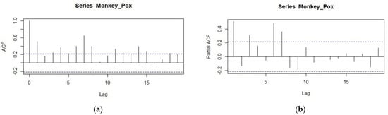 Correlogram of the monkeypox for 1st difference. (a) ACF; (b) Partial ACF.