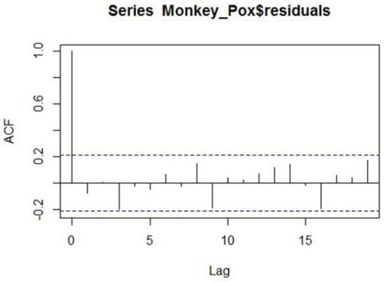 By using the order of the correlogram and using the subjective approach we will estimate the significant parameters of the series. The different combination of the candidate model is given in Table 5. From the output, it is found that among the three different classes of models the model ARIMA (7,1,7) is the best fit for the series as it has low values of the accuracy measure so the model is found significant according to the accuracy criteria, we will check the model and apply the diagnostic checking. To this end, we will make the ACF of the residuals and if there is no lag out from the boundary of 95% confidence interval the candidate model seems to be the best and most significant to model the series. The ACF of the candidate model ARIMA (7,1,7) is given in Figure 4. From the ACF plot, it can be observed that no lag exceeds the confidence limits, so the model seems significant in forecasting the series of Monkeypox. Further the actual versus the fitted values from the model ARIMA (7,1,7) are shown in Figure 5.