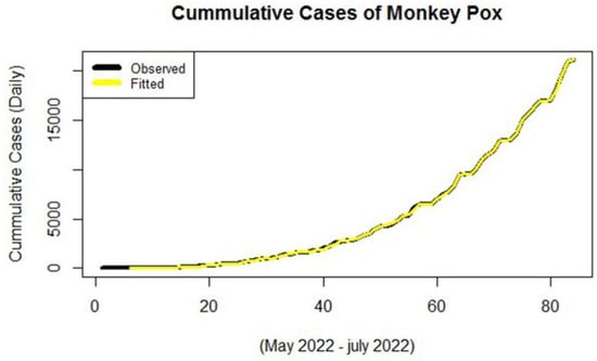 The daily cumulative samples of monkeypox are collected for analysis purposes. Recommendations on the minimum necessary number of time points for time series analysis vary, however, there is considerable consensus that this minimum requirement is in the middle two-digit range, for instance, “… 40 observations is often mentioned as the minimum number of observations for a time series analysis” [27], “Most time series experts suggest that the use of time series analysis requires at least 50 observations in the time series.” [30]. There are a total of 84 samples that are part of the analysis therefore formal time series analysis can be performed for future forecasting. The analysis begins by making a graph of the monkeypox cumulative cases. The graph of the monkeypox series is presented in Figure 2.