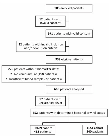 A total of 983 paediatric patients aged 7 days to 36 months with a suspected SBI were enrolled. Forty-four patients were excluded due to either invalid informed consent or invalid inclusion and/or exclusion criteria (Figure 1). Out of 939 eligible patients, 270 with missing biomarker data because of venipuncture failure were excluded from the analysis (Figure 1). Of the 669 analysed patients, 17 (2.6%) had an indeterminate infection status (unclassified fever), according to the expert adjudication committee (Figure 1 and Table 1). A total of 652 patients with a determined infection status were partitioned into a training cohort (TRAIN set; n = 412) for biomarker computational modelling and a validation cohort (TEST set; n = 240) for the confirmation of model performance on an independent cohort (Figure 1).
