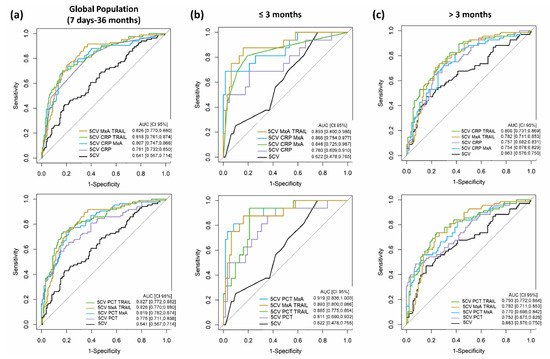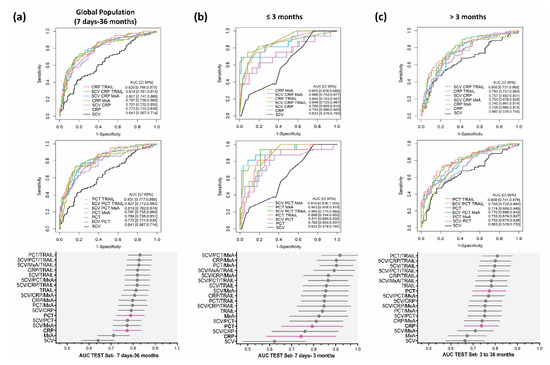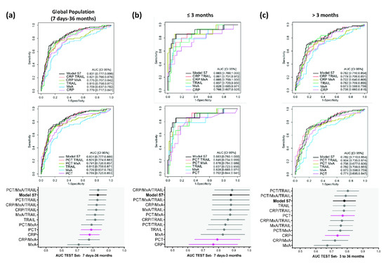 Performance of models combining biomarkers and clinical variables using machine learning (TEST set). ROC curves and forest plots of best performing models are shown for the global population (a), the ≤3-month-old patients (b), and the >3-month-old patients (c). The upper ROC curves show the comparisons to CRP (pink curves) and the lower ROC curves the comparisons to PCT (pink curves). The clinical variables alone (5CV) are shown as black curves. The forest plots depict AUC (plain circles) and respective 95% CI (horizontal whiskers). Complete performance results are shown in Table S7. In terms of AUC, PCT/TRAIL performed best in the global population, with an AUC of 0.831. The difference in AUC between PCT/TRAIL and PCT (AUC = 0.789) was close to statistically significant (p = 0.056), while that between PCT/TRAIL and CRP (AUC = 0.773) was statistically significant (p = 0.025). In the ≤3-month-old group, the best model in respect of both AUC and LR was 5CV/PCT/MxA (AUC = 0.919, LR+ = 21.31, LR− = 0.32). The differences in AUC between 5CV/PCT/MxA and PCT (AUC = 0.793) and between 5CV/PCT/MxA and CRP (AUC = 0.743) were both statistically significant (p = 0.030 and p = 0.005, respectively).