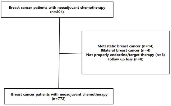 This study was a medical record review based on a prospectively collected cohort. We included 772 patients who were diagnosed with invasive breast cancer, cytology proven axillary node positive, and treated with NAC followed by curative surgery at Samsung Medical Center between January 2007 and December 2015 (Figure 1). Inclusion criteria were patients who (1) were female with unilateral breast cancer, (2) were cytology proven axillary node positive before NAC, (3) completed all intended cycles of NAC before surgery, (4) underwent ALND after NAC, (5) had complete surgical resection of the tumor and negative surgical margins. We excluded any cases of metastatic breast cancer, bilateral breast cancer and patients who did not properly perform endocrine treatment or target therapy. Two groups were analyzed for the study, one group had less than 10 lymph nodes (<10 nodes group) after ALND and the other had 10 or more lymph nodes (≥10 nodes group). The DFS was defined as the time interval between date of diagnosis and date of first recurrence or last follow-up or death, whichever came first. The OS was defined as the time interval between date of diagnosis and date of last follow-up or death.