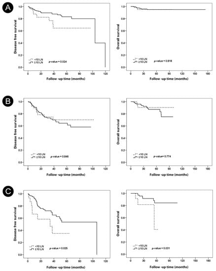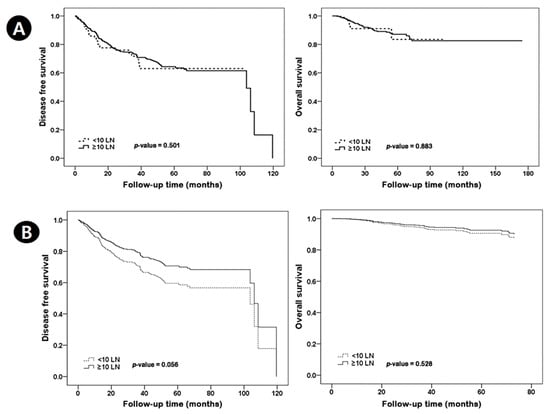 Among the 285 ypN0 patients, the <10 nodes group included 69 patients and the ≥10 nodes group included 216 patients. There were 13 recurrences in the <10 lymph nodes group, of which 5 had local recurrence, 26 had recurrence in the ≥10 lymph nodes group, and 7 had local recurrence. Table 2 shows the characteristics of the pathologic node-negative ALND group according to removed lymph node number. The ypN0 group with <10 nodes had no significantly different characteristics compared with the ypN0 group with ≥10 nodes. In the ypN0 subgroup, the <10 nodes group had worse DFS than the ≥10 nodes group (p = 0.024). There was no significant difference in OS between the <10 nodes group and the ≥10 nodes group (p = 0.818) (Figure 4A).