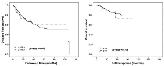 Among 772 patients treated with NAC and ALND, the <10 nodes group included 123 patients and the ≥10 nodes group included 649 patients. There were 285 ypN0, 258 ypN1, 135 ypN2, and 94 ypN3 cases. The median follow-up was 69.0 months. Table 1 shows the characteristics of patients according to lymph node number. The <10 nodes group had alower BMI, radiotherapy recipient rate, and pathologic stage than the ≥10 nodes group. The <10 nodes group had 29.2% breast pCR and 56.1% axillary pCR. The ≥10 nodes group had 19.1% breast pCR and 33.3% axillary pCR. The proportion of patients with residual nodal burden was 43.9% in the <10 node group, and 66.7% in the ≥10 nodes group. The proportion of positive nodes out of total nodal harvest was 1.4/8.6 positive nodes (16.3%) in the <10 nodes group and 2.2/14.7 in the ≥10 nodes group (15.0%). In the <10 nodes group, there were 31 recurrences, of which 16 (breast recurrence: 4, axilla recurrence: 12) had local recurrence. In the ≥10 nodes group, 153 had recurrence, of which 68 (breast recurrence: 14, axilla recurrence: 53, both recurrence: 1) had local recurrence. There was no significant difference in disease-free survival (DFS, p = 0.949) and overall survival (OS, p = 0.734) between the <10 nodes group and the ≥10 nodes group. After compensating ypT and ypN staging, there was a strong trend in DFS; however, there was no significant difference in DFS (p = 0.056) and OS (p = 0.528) between the <10 nodes group and the ≥10 nodes group (Figure 2). There were no significant difference in DFS(p = 0.972) and OS (p = 0.758) in LN positive patients (Figure 3).