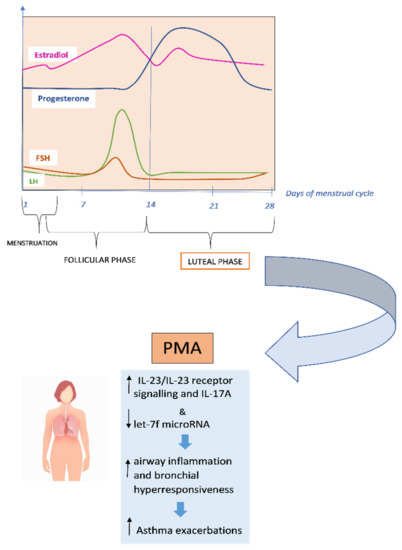 In the study by Newcomb et al., researchers found that estrogen and progesterone, in individuals with severe asthma, increased IL-23/IL-23 receptor signalling and IL-17A production while decreased let-7f microRNA expression. Compared to men, TH17 cells of both women with severe asthma and healthy controls produced more IL-17A, increased the expression of IL-23R, while decreased let-7f microRNA expression [81]. In the research by Semik-Orzech et al., thirty-three women of childbearing age were prospectively followed through the measure of sex hormones and the determination of sputum inflammatory cell count and serum inflammatory interleukins, on the 10th and 26th day of each cycle during 12 weeks of observation. Thirteen women were diagnosed with PMA, ten were non-PMA asthmatics (n = 10), and ten were healthy controls. The authors found that in PMA patients, the cycle’s luteal phase was associated with increased serum 17β-estradiol levels with concurrent higher sputum concentration of IL-5 and IL-8 and inflammatory cell count [82]. PMA is more common in older, overweight and aspirin-sensitive women. These women also tend to have longer asthmatic episodes and more severe exacerbations. They are more likely to experience premenstrual syndrome, shorter menstrual cycles, more severe menstrual bleeding, dysmenorrhea, and shorter periods [83]. Additionally, compared to women without PMA, women with PMA have higher rates of urgent medical visits, absenteeism, and usage of β2-agonist rescue [84]. PMA does not always respond to traditional asthma therapy. According to GINA (Global Initiative for Asthma) guidelines, contraceptive pills and/or leukotriene receptors, antagonists may be useful (evidence D) in the prevention and treatment of PMA [75,85]. Currently, additional hormonal therapies such as estrogens, progestogens, gonadotropin-releasing hormone (GnRH) analogues and androgens are taken into consideration [5,86,87,88,89].
