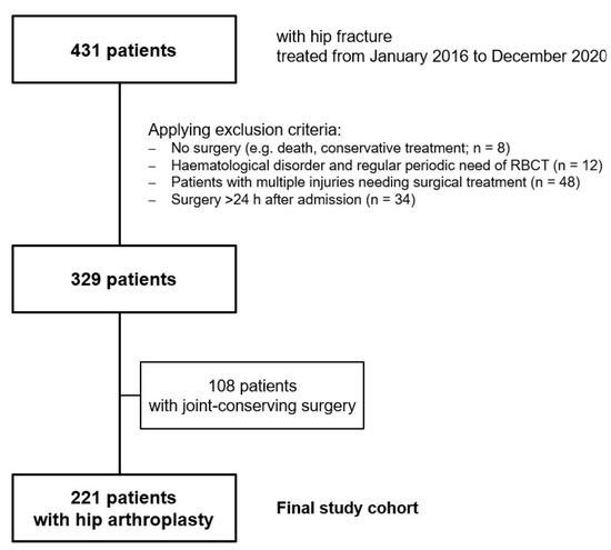 All of the presented data were obtained retrospectively with permission from the local ethical committee, and they were stored anonymously. Between January 2016 and December 2020, 431 patients were treated for an acute hip fracture in our level 1 trauma centre. We subsequently excluded patients who did not undergo a following surgical treatment due to death or them having a conservative treatment, patients with haematological disorders and the regular periodic need of RBCT, patients with blood clotting disorders, patients with additional injuries in need of surgical care and patients who were not operated within 24 h after their admission. The main reasons for surgery being performed after 24 h were an acute medical condition that needed to be treated before surgery, and organisational reasons, such as a lack of operating room capacity. After applying the exclusion criteria, 329 patients were identified. From the patients who were treated within 24 h, 221 received hip arthroplasty surgery and 108 patients received joint-conserving surgery (DHS or FNS, Co. DePuy Synthes, West Chester, PA, USA). Ultimately, we included 221 patients in the study, and from these, 209 received a dual head prothesis (CORAIL® Hip System, SELF-CENTERINGTM Bipolar head, Co. DePuy Synthes, West Chester, PA, USA) and 12 received a total endoprosthesis (CORAIL® Hip System, PINNACLE® Acetabular Cup System, Co. DePuy Synthes, West Chester, PA, USA; Figure 1).