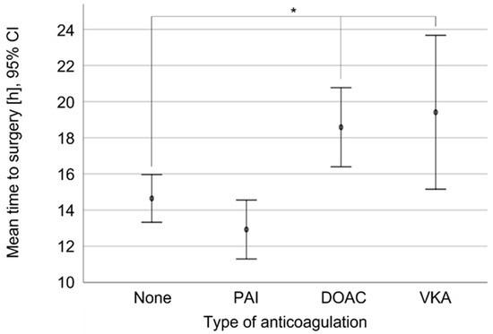 The overall mean time to surgery was 14.9 ± 7.0 h (Table 2). The anticoagulative treatment with DOAC (18.6 ± 6.3 h, n = 34) and VKA (19.4 ± 5.5 h, n = 9) increased the time to surgery when it was compared to the controls (14.7 ± 7.0 h, n = 110). In the case of the non-anticoagulated group which was compared to the PAI patient group (12.9 ± 6.7 h, n = 68), the differences were not statistically significant (p = 0.42; Figure 2).