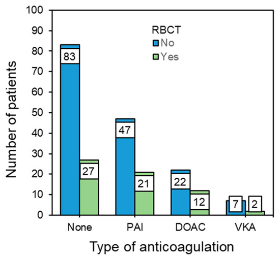 Red blood cell transfusion (RCBT) depending on anticoagulative medication. PAI: Platelet aggregation inhibitors including acetylsalicylic acid; DOAC: Direct oral anticoagulants; VKA: Vitamin-K-antagonist Warfarin.